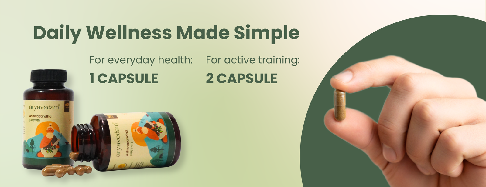 Aryavedam Ashwagandha is a carefully crafted capsule designed by experts to support overall well-being and daily balance.